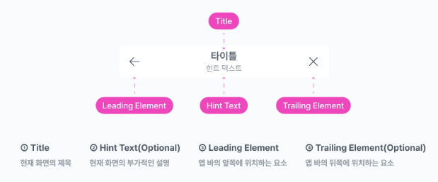 - 트레일링 엘리먼트 : 설정이나 더보기 등 현재 화면과 관련된 보조 기능들을 제공할 수 있는 영역