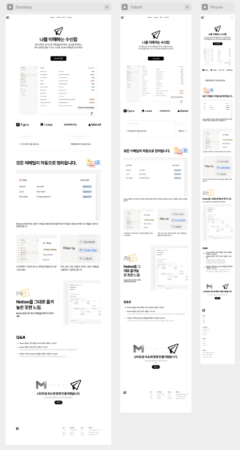 목차 웹사이트 섹션 개념반응형 디자인 개념실습 _ 랜딩페이지 제작 웹사이트 섹션 개념 Section설명Header (Navigation) 페이지 상단에 위치하는 영역. 모든 페이지에서 공통 사용(로고, 내비게이션 메뉴, 로그인/회원가입 버튼 등)Hero Section 메인 섹션. 방문자를 사로잡는 헤드라인, 서브헤드라인, CTA, 비주얼 등 포함About Section 서비스나 브랜드에 대한 소개를 담은 영역.(브랜드 미션, 가치, 회사 소개 등)Feature Section 제품이나 서비스의 핵심 기능이나 혜택을 설명하는 영역Testimonial / Review Section 제품이나 서비스의 핵심 기능이나 혜택을 설명하는 영역FAQ Section 자주 묻는 지룬과 답변을 정리한 섹션Pricing ..
